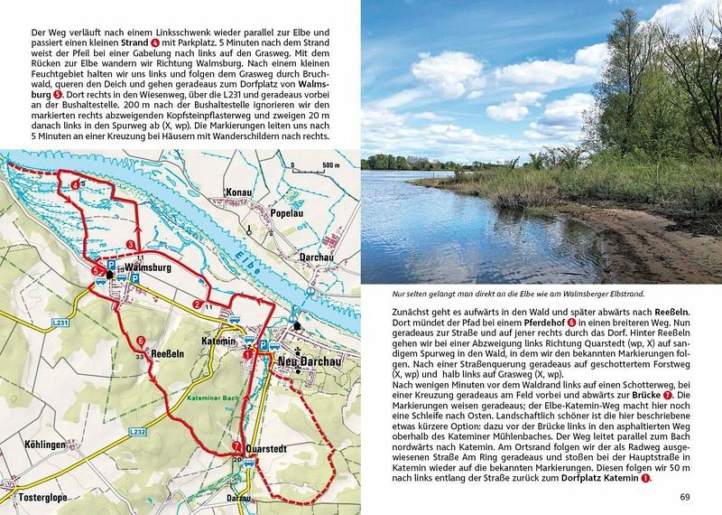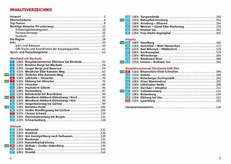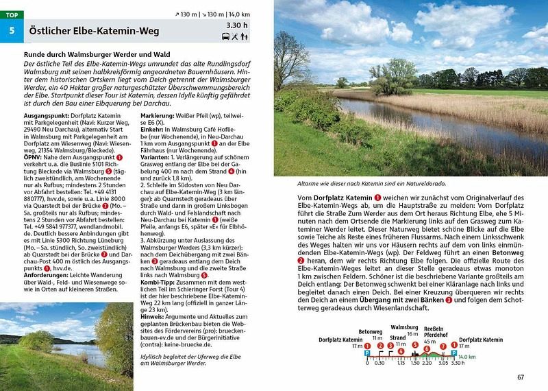 Entlang der Elbe konnte sich die Flusslandschaft über Jahrzehnte in der ehemaligen innerdeutschen Grenzregion fast ungestört entwickeln. Weiden, Wälder, Binnendünen und Heide säumen die Elbe, idyllisch liegen kleine Städte wie Havelberg, Stendal, Boizenburg oder Bad Wilsnack. Der Wanderführer präsentiert die Landschaften der Elbtalaue mit vielen schönen Wanderungen, auch informative Stadtrundgänge sind dabei. Besonders lohnenswert sind der Elbe-Katemin-Weg und der Höhbeck Elbholzweg. Ein weiteres Highlight ist der Wendland-Rundweg, ein reizvoller Weitwanderweg, der in zehn Etappen von Hitzacker aus durch das Wendland führt. Die Etappen sind so gestaltet, dass sie sich auch als Tageswanderungen bestens eignen.