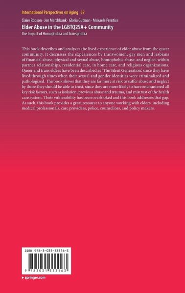 This book describes and analyzes the lived experience of elder abuse from the queer community. It discusses the experiences by transwomen, gay men and lesbians of financial abuse, physical and sexual abuse, homophobic abuse, and neglect within partner relationships, residential care, in home care, and religious organizations. Queer and trans elders have been described as 'The Silent Generation', since they have lived through times when their sexual and gender identities were criminalized and pathologized. The book shows that they are far more at risk to suffer abuse and neglect by those they should be able to trust, since they are more likely to have encountered all key risk factors, such as isolation, previous abuse and trauma, and mistrust of the health care system. Their vulnerability has been overlooked and this book addresses that gap. As such, this book provides a great resource to anyone working with elders, including medical professionals, care providers, police, counsellors, and policy makers.