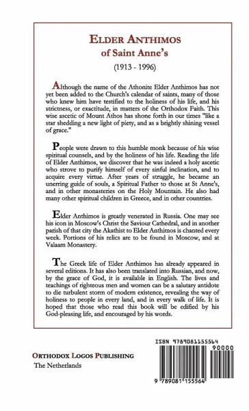 It is with great pleasure that we announce the publication of the long-awaited English language edition of Elder Anthimos Of Saint Anne's, The wise and God-bearing Contemporary Father of Athos, by Dr. Charalambos M. Bousias. It was translated from the sixth Greek edition of 2004, and contains material not included in the Greek edition. Although the name of the Athonite Elder Anthimos (1913-1996) has not yet been added to the Church's calendar of saints, many of those who knew him have testified to the holiness of his life, and his strictness, or exactitude, in matters of the Orthodox Faith. This wise ascetic of Mount Athos has shone forth in our times "like a star shedding a new light of piety, and as a brightly shining vessel of grace."People were drawn to this humble monk because of his wise spiritual counsels, and by the holiness of his life. Reading the life of Elder Anthimos, we discover that he was indeed a holy ascetic who strove to purify himself of every sinful inclination, and to acquire every virtue. After years of struggle, he became an unerring guide of souls, a Spiritual Father to those at St Anne's, and in other monasteries on the Holy Mountain. He also had many other spiritual children in Greece, and in other countries. Elder Anthimos is also greatly venerated in Russia. One may see his icon in Moscow's Christ the Saviour Cathedral, and in another parish of that city the Akathist to Elder Anthimos is chanted every week. Portions of his relics are to be found in Moscow, and at Valaam Monastery. The Greek life of Elder Anthimos has already appeared in several editions. It has also been translated from Greek into Russian, and now, by the grace of God, it is available in English. The lives and teachings of righteous men and women can be a salutary antidote to the turbulent storm of modern existence, revealing the way of holiness to people in every land, and in every walk of life. It is hoped that those who read this book will be edified by his God-pleasing life, and encouraged by his words.New to this volume are some of the liturgical services in honor of Elder Anthimos, composed by Dr. Bousias, who is also a noted hymnographer. The service of Great Vespers, the Supplicatory Canon, and Matins were originally printed in a separate booklet. Now, the biographical and liturgical materials are conveniently gathered together in a single volume, which contains several photographs, many of them in color. A special Introduction to the English edition places Elder Anthimos within the context of Orthodox Tradition, and the spiritual history of Mount Athos. The influence of Elder Anthimos is not limited to St Anne's Skete, or to Mount Athos, for his life and teachings have great significance for the whole world. A Glossary has also been added, providing useful definitions of Orthodox terms for those who may not be familiar with them.