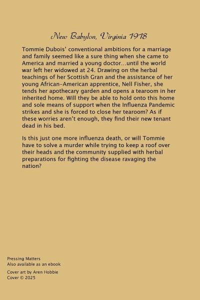 ELDER LEGACIES, book one of a planned series, is an 85K word adult mystery set in 1918 America. This whodunit will resonate with readers of Susan Wittig Albert's China Bayles herbal mysteries, especially QUEEN ANNE'S LACE, and MRS. JEFFRIES VICTORIAN MYSTERY series by Emily Brightwell. Originally from Scotland, Thomasina 'Tommie' Dubois at 24 finds herself a WWI widow. With the assistance of her16-year-old African American apprentice, Nell Fisher, Tommie owns and runs a tearoom and apothecary in her inherited Victorian home. The bedroom community of New Babylon, situated near the nation's capital, appears to be a sleepy village but it holds dark secrets harking back to the days of slavery, as Tommie discovers when her boarder, Clarence Patterson, is found dead in his room. Has the deadly influenza raging across the globe struck, as the doctor hastily declares? This appears likely--- until Nell is abducted. A reluctant and inexperienced sleuth, Tommie rises to the challenge. Initially Tommie's greatest wish is to be mistress of a traditional home filled with family and homemaking modeled after MRS. BEETON'S BOOK OF HOUSEHOLD MANAGEMENT, a Victorian Martha Stewart. Tommie clings to the book's promises of orderly habits resulting in guaranteed happiness despite all evidence to the contrary. Ever optimistic and sometimes comically naïve, Tommie tries to make her way in a man's world and finds she may have more in common with the rabble-rousing suffragists than with Mrs. Beeton.