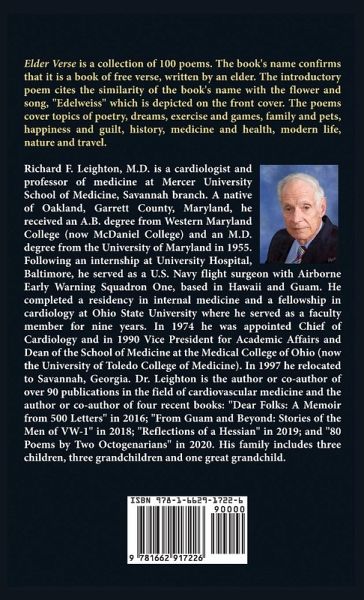 "Elder Verse" is a collection of 100 poems. The book's name confirms that it is a book of free verse, written by an elder. The introductory poem cites the similarity of the book's name with the flower and song, "Edelweisse" which is depicted on the front cover. The poems cover topics of poetry, dreams, exercise and games, family and pets, happiness and guilt, history, medicine and health, modern life, nature and travel. ¿