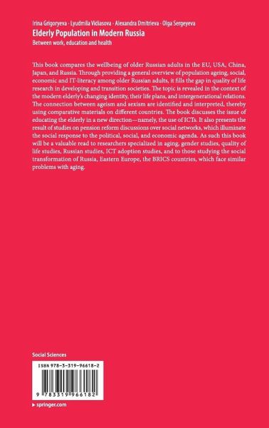 This book compares the wellbeing of older Russian adults in the EU, USA, China, Japan, and Russia. Through providing a general overview of population ageing, social, economic and IT-literacy among older Russian adults, it fills the gap in quality of life research in developing and transition societies. The topic is revealed in the context of the modern elderly's changing identity, their life plans, and intergenerational relations. The connection between ageism and sexism are identified and interpreted, thereby using comparative materials on different countries. The book discusses the issue of educating the elderly in a new direction-namely, the use of ICTs. It also presents the result of studies on pension reform discussions over social networks, which illuminate the social response to the political, social, and economic agenda. As such this book will be a valuable read to researchers specialized in aging, gender studies, quality of life studies, Russian studies, ICT adoptionstudies, and to those studying the social transformation of Russia, Eastern Europe, the BRICS countries, which face similar problems with aging.