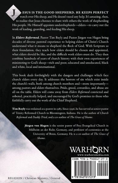 Jesus is the Good Shepherd. He keeps perfect watch over His sheep, and He doesn't need any help. It's amazing, then, to realize that Jesus chooses to share with others the work of shepherding His people. He Himself appoints undershepherds-elders-to carry out the work of leading, guarding, and feeding His sheep.In Elders Reformed, Pastor Tim Bayly and Pastor Jürgen von Hagen bring decades of diverse pastoral experience to helping elders of Christ's Church understand what it means to shepherd the flock of God. With Scripture as their foundation, they teach how elders should be chosen and appointed, what elders should be like, and the difficult work elders must do. They then combine hundreds of years of church history with their own experiences of ministering to God's sheep-rich and poor, educated and uneducated, black and white, local and international.This book deals forthrightly with the dangers and challenges which face church elders every day. It addresses the horrors of sin which exist inside the church's walls, both among church members and-more importantly-among pastors and elders themselves. Pride, greed, cowardice, and abuse are all on the table. Elders will come away from Elders Reformed convicted and sobered, practically helped, and encouraged by God's promises to those who faithfully carry out the work of the Chief Shepherd.