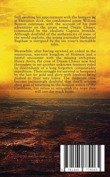 Book 2: Still awaiting his appointment with the hempen jig at Execution dock, the condemned pirate William Benton continues with the account of his past adventures on the pirate vessel Dream Chaser, commanded by the idealistic Captain Ironside. Although doubtful of the authenticity of some of the retold exploits, the young journalist Nathaniel Bagshaw is intrigued by the sea rover's incredible tales. Meanwhile, after having survived an ordeal in the mysterious, war-torn kingdom of Holstein and a fateful encounter with the missing arch-pirate Henry Avery, the crew of Dream Chaser now find themselves in yet another unknown territory ruled by descendants of a long forgotten conquistador expedition. Their struggle for survival is hampered by the lust for gold and glory with loyalties being pushed to their very limits. The desperate crew become increasingly doubtful that they'll achieve their goal of returning to the familiar waters of the Caribbean, but refuse to relinquish the hope they will one day reach home.