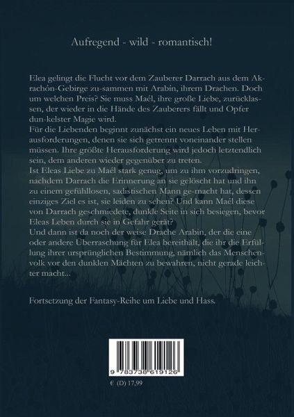 Elea gelingt die Flucht vor dem Zauberer Darrach aus dem Akrachón-Gebirge zusammen mit Arabín, ihrem Drachen. Doch um welchen Preis? Sie muss Maél, ihre große Liebe, zurücklassen, der wieder in die Hände des Zauberers fällt und Opfer dunkelster Magie wird.Für die Liebenden beginnt von nun an ein neues Leben mit Herausforderungen, denen sie sich getrennt voneinander stellen müssen. Ihre größte Herausforderung wird jedoch letztendlich sein, dem anderen wieder gegenüber zu treten.Ist Eleas Liebe zu Maél stark genug, um zu ihm vorzudringen, nachdem Darrach die Erinnerung an sie gelöscht hat und ihn zu einem gefühllosen, sadistischen Mann gemacht hat, dessen einziges Ziel es ist, sie leiden zu sehen? Und kann Maél diese von Darrach geschmiedete, dunkle Seite in sich besiegen, bevor Eleas Leben durch sie in Gefahr gerät?Und dann ist da noch der weise Drache Arabin, der die eine oder andere Überraschung für Elea bereithält, die ihr die Erfüllung ihrer ursprünglichen Bestimmung, nämlich das Menschenvolk vor den dunklen Mächten zu bewahren, nicht gerade leichter macht...