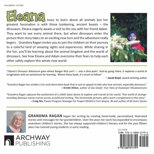 Eleana loves to learn about all animals but her greatest fascination is with those lumbering, ancient beasts - the dinosaurs. Eleana eagerly awaits a visit to the zoo with her friend Adam. They want to see every animal there, but when dinosaurs enter the picture their story takes on an exciting new turn and the adventure really begins. Grandma Ragan invites you to join the children on their journey to a colorful land of amazing sights and experiences. While sharing in the fun, you'll be learning about the animal kingdom and the world of dinosaurs. See how Eleana and Adam overcome their fears to help each other safely explore this whole new world. "Eleana's Dinosaur Adventure goes where Ranger Rick can't - into a dino-park! And by going there, it explores a world of imagination with an excitement for learning. Where Elena leads, it's smart to follow." --Jacob Boyd, award-winning author "Grandma Ragan has written a fun and informative book that is sure to appeal to kids who love animals, especially dinosaurs." --Kristin Hilton, author of Zoo Goofs: True Tales of Zookeeper Misadventures "Grandma Ragan captures the excitement of a child's basic desire to explore and marvel at her world. That world of strange-sounding dinosaur names comes across as bold and inviting. The homemade pictures add a warm complement to the story." --Craig Nix, Parent Program Manager for Project READS in Fort Wayne, IN and author of 60 short stories