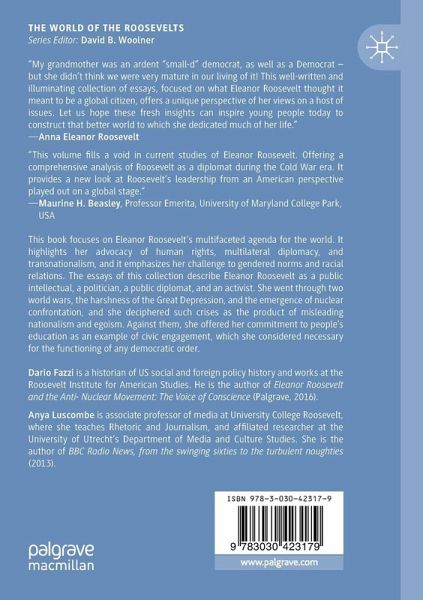 This book focuses on Eleanor Roosevelt's multifaceted agenda for the world. It highlights her advocacy of human rights, multilateral diplomacy, and transnationalism, and it emphasizes her challenge to gendered norms and racial relations. The essays of this collection describe Eleanor Roosevelt as a public intellectual, a politician, a public diplomat, and an activist. She was, undeniably, one of the protagonists of the twentieth century and a proactive interpreter of the many changes it brought about. She went through two world wars, the harshness of the Great Depression, and the emergence of nuclear confrontation, and she deciphered such crises as the product of misleading nationalism and egoism. Against them, she offered her commitment to people's education as an example of civic engagement, which she considered necessary for the functioning of any democratic order. Such was the world Eleanor Roosevelt envisioned and tried to build -symbolically and practically - one where people, the citizens of the world, may really be at the center of international affairs.