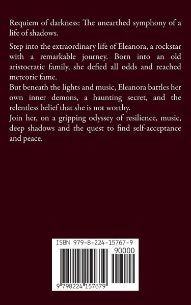 Requiem of darkness: The unearthed symphony of a life of shadows. Step into the extraordinary life of Eleanora, a rockstar with a remarkable journey. Born into an old aristocratic family, she defied all odds and reached meteoric fame. But beneath the lights and music, Eleanora battles her own inner demons, a haunting secret, and the relentless belief that she is not worthy. Join her, on a gripping odyssey of resilience, music, deep shadows and the quest to find self-acceptance and peace.