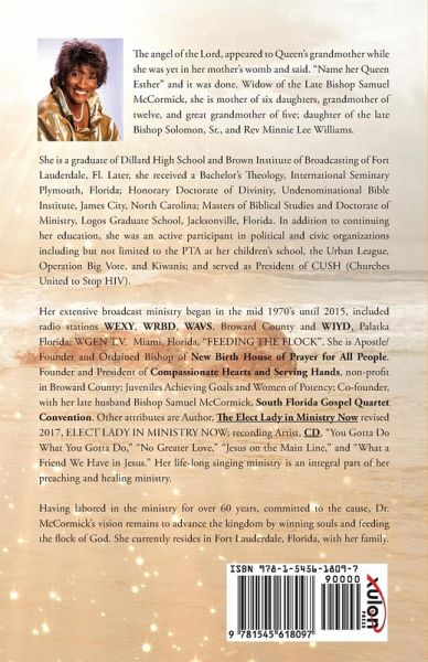 The angel of the Lord, appeared to Queen's grandmother while she was yet in her mother's womb and said. "Name her Queen Esther" and it was done. Widow of the Late Bishop Samuel McCormick, she is mother of six daughters, grandmother of twelve, and great grandmother of five; daughter of the late Bishop Solomon, Sr., and Rev Minnie Lee Williams. She is a graduate of Dillard High School and Brown Institute of Broadcasting of Fort Lauderdale, Fl. Later, she received a Bachelor's Theology, International Seminary Plymouth, Florida; Honorary Doctorate of Divinity, Undenominational Bible Institute, James City, North Carolina; Masters of Biblical Studies and Doctorate of Ministry, Logos Graduate School, Jacksonville, Florida. In addition to continuing her education, she was an active participant in political and civic organizations including but not limited to the PTA at her children's school, the Urban League, Operation Big Vote, and Kiwanis; and served as President of CUSH (Churches United to Stop HIV). Her extensive broadcast ministry began in the mid 1970's until 2015, included radio stations WEXY, WRBD, WAVS, Broward County and WIYD, Palatka Florida; WGEN T.V. Miami, Florida, "FEEDING THE FLOCK". She is Apostle/Founder and Ordained Bishop of New Birth House of Prayer for All People. Founder and President of Compassionate Hearts and Serving Hands, non-profit in Broward County; Juveniles Achieving Goals and Women of Potency; Co-founder, with her late husband Bishop Samuel McCormick, South Florida Gospel Quartet Convention. Other attributes are Author, The Elect Lady in Ministry Now revised 2017, ELECT LADY IN MINISTRY NOW; recording Artist, CD, "You Gotta Do What You Gotta Do," "No Greater Love," "Jesus on the Main Line," and "What a Friend We Have in Jesus." Her life-long singing ministry is an integral part of her preaching and healing ministry. Having labored in the ministry for over 60 years, committed to the cause, Dr. McCormick's vision remains to advance the kingdom by winning souls and feeding the flock of God. She currently resides in Fort Lauderdale, Florida, with her family.