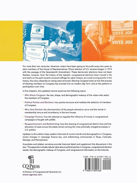 This companion guide to the celebrated How Congress Works delivers a solid, broad-based introduction to how American voters elect their representatives. Historical perspective covers how the process has changed throughout our country's history, as one barrier to voting after another has fallen to pressure for wider suffrage. In Electing Congress, CQ's election experts examine why only half of those who are eligible to vote actually exercise their franchise in major elections, and even fewer in off years without a presidential contest. They present a coherent picture of the demographic makeup of Congress, the direction of political parties, campaign financing, reapportionment and redistricting. Electing Congress is the easy-to-read and authoritative source that covers the essentials in every aspect of how America elects its legislators.