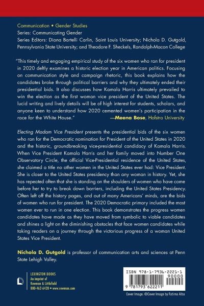 Electing Madam Vice President presents the presidential bids of the six women who ran for the Democratic nomination for President of the United States in 2020 and the historic, groundbreaking vice-presidential candidacy of Kamala Harris.When Vice President Kamala Harris and her family moved into Number One Observatory Circle, the official Vice Presidential residence of the United States, she claimed a title no other women in the United States ever had: Vice President. She is closer to the United States presidency than any woman in history. Yet, she has repeated often that she is standing on the shoulders of women who have come before her to try to break down barriers, including the United States Presidency. Often left off the history pages, and out of many Americans' minds, are the bids of women who run for president. The 2020 Democratic primary included the most women ever to run in one election. This book demonstrates the progress women candidates have made as they have moved from symbolic to viable candidates and shines a light on the diminishing obstacles that face women candidates while taking readers on a journey through the victorious progress of a woman United States Vice President.