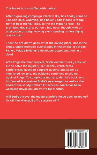 This ballot box was stuffed with malice... After a grueling campaign, Election Day has finally come to Jackson Hole, Wyoming, and baker Sadie Moose is ready for her best friend, Paige, to win the Mayor's race. The promising day starts out on a grim note, though, with an altercation at a sign waving event sending rumors flying across town. Then the fire alarm goes off at the polling place, and in the chaos, Sadie stumbles over a body in the smoke. It's Wade Fisher, Paige's billionaire developer opponent. And he's dead. With Paige the prime suspect, Sadie and her quirky crew set out to solve the mystery. But as they crash press conferences, duck federal agents, question pageant queens, and sober up inebriated lawyers, the evidence continues to pile up against Paige. To complicate matters, Sadie's ex, Merritt, is back, and his fiancé is Sadie's new lawyer, as well as the head of the shady Gotham Enterprises, which has been wreaking havoc on Sadie's life for months. Will Sadie unravel the mystery before Paige gets locked up? Or will the killer pull off a surprise win?