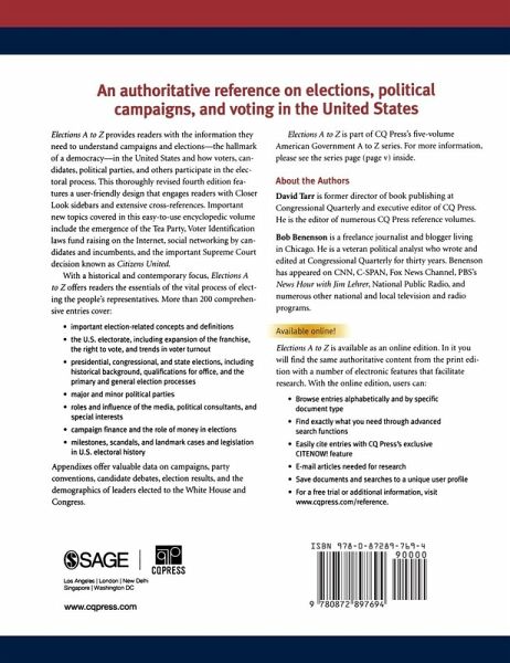 Combining the rich content of the print edition with the advanced online functionality demanded by today's researchers, Elections A to Z: Online Edition is the ultimate 21st century research tool for finding current, accurate information on U.S. elections. Advanced Web-enabled features allow users to conduct searches from A to Z on election. Like all CQ Press online editions, Elections A to Z: Online Edition comes loaded with powerful user-friendly functions such as CiteNow!, which lets researchers download full citations in MLA, APA, Bluebook, and other formats. Elections A to Z explains how campaigns and elections, the hallmark of any democracy, are conducted in the United States. The new third edition has been redesigned and updated with new entries covering the vital current elections topics that readers want to know about. Entries range from short definitions of terms like front-runner to in-depth essays exploring vital aspects of campaigns and elections, such as the right to vote, turnout trends, and the history, evolution, and current state of House, Senate, presidential, and some state-level elections. Readers will find essential information on: Stages in the campaign process and the general election The roles of political consultants, the media, and political parties Debates and issues such as term limits, majority-minority districts, and campaign finance Amendments, legislation, and court cases that have shaped electoral, campaign, and voting matters Voter turnout and voting rights in the United States Important terms and concepts like absolute majority and dark horse Highlights of presidential elections throughout U.S. history