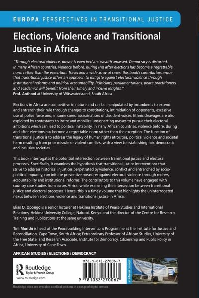 This book examines the hypothesis that transitional justice interventions that strive to address historical injustices perpetrated by violence, conflict and entrenched by socio-political impunity, can initiate preventive measures against electoral violence through redress, accountability and institutional reforms.
