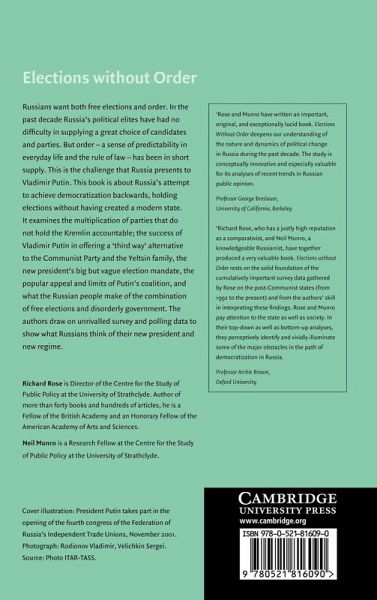 'Rose and Munro have written an important, original, and exceptionally lucid book. Elections Without Order deepens our understanding of the nature and dynamics of political change in Russia during the past decade. The study is conceptually innovative and especially valuable for its analyses of recent trends in Russian public opinion.' Professor George Breslauer, University of California, Berkeley
