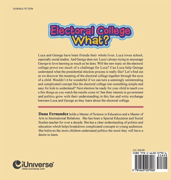 Luca and George have been friends their whole lives. Luca loves school, especially social studies. And George does not. Luca's always trying to encourage George to love learning as much as he does. Will the new topic on the electoral college prove too much of a challenge for Luca? Can Luca help George understand what the presidential election process is really like? Let's find out as we discover the meaning of the electoral college together through the eyes of a child. Wouldn't it be wonderful if we can turn a seemingly uninteresting and complicated concept like the electoral college into something simple and easy for kids to understand? Next election be ready for your child to teach you a few things as you watch the results come in! See their interest in government and politics grow with their understanding in this fun and witty exchange between Luca and George as they learn about the electoral college.