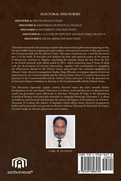 This book contains five electoral essays and five discourses which explore issues impacting on free, fair and credible election organisation and conduct, with special attention on best practices in the Commonwealth and the African Union. The essays constitute part 1 and the discourses part 2 of the book. It describes and analyses the slow and cautious restart of the process of democratic elections in Nigeria, examining the missteps along the way from the first to the fourth electoral cycle which ended in 2011, which constitute essay I. Essay II deals with the development of election observation, together with mechanisms to strengthen the effectiveness thereof in the African Union and promote the technical capabilities of African Union electoral management bodies. Essay III seeks to compare aspects of election observation by the Commonwealth and the African Union. Essay IV examines best electoral practices in the Commonwealth and the African Union and essay V with the potential use of alternative dispute resolution in elections in the Commonwealth and the African Union. The discourses vigorously explore current electoral issues that slant towards further development in the near future. Discourse A is about youth and elections. It discusses how youth can participate more effectively in elections. Discourse B looks at the dimensions of political finance with particular attention to campaign financing. Discourse C is about incumbency and elections and discusses the nature and impact of incumbency on elections. Discourse D is about the culture of impunity which affects many electoral management bodies and in particular as it pertains to election violence. Discourse E deals with the impact of social media on election preparation and conduct.