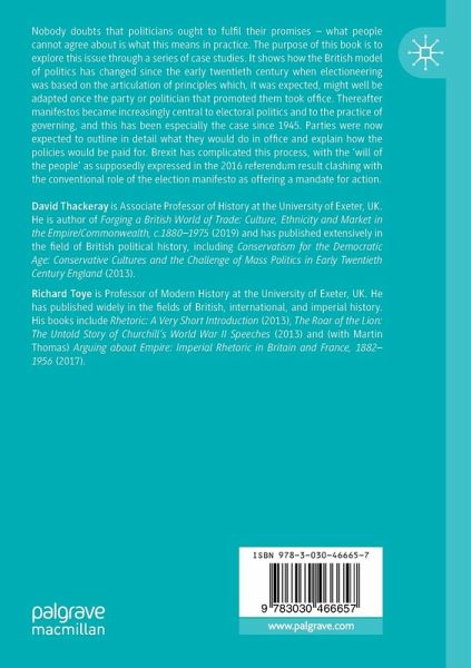 Nobody doubts that politicians ought to fulfil their promises - what people cannot agree about is what this means in practice. The purpose of this book is to explore this issue through a series of case studies. It shows how the British model of politics has changed since the early twentieth century when electioneering was based on the articulation of principles which, it was expected, might well be adapted once the party or politician that promoted them took office. Thereafter manifestos became increasingly central to electoral politics and to the practice of governing, and this has been especially the case since 1945. Parties were now expected to outline in detail what they would do in office and explain how the policies would be paid for. Brexit has complicated this process, with the 'will of the people' as supposedly expressed in the 2016 referendum result clashing with the conventional role of the election manifesto as offering a mandate for action.
