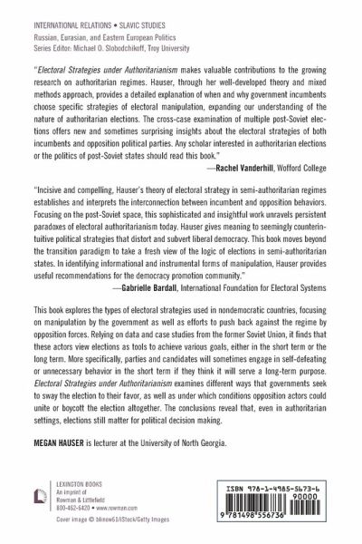 This book explores the factors that explain incumbent and opposition behavior in electoral authoritarian regimes. It focuses on states in the post-Soviet region and finds variation in the types of manipulation, the formation of opposition coalitions as well as election boycotts.