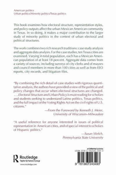 This book examines how electoral structure, representation styles and policy outputs affect the Mexican American community in Texas. In so doing, it makes a major contribution to the larger study of minority politics in the context of urban electoral and political structures.