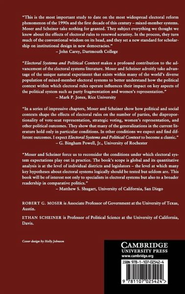1. Introduction: why don't electoral rules have the same effects in all countries?; 2. When do the effects of electoral systems diverge from our expectations?; 3. Mixed-member electoral systems: how they work and how they work for scholars; 4. How democratic experience and party system development condition the effects of electoral rules on disproportionality and the number of parties: theory, measurement, and expectations; 5. How democratic experience and party system development condition the effects of electoral rules on disproportionality and the number of parties: what we actually see; 6. Political context, electoral rules, and their effects on strategic and personal voting; 7. How democratic experience and party system development condition the effect of electoral rules on strategic defection; 8. Social diversity, electoral rules, and the number of parties; 9. How political context shapes the effect of electoral rules on women's representation; 10. Conclusion: why and how political context matters for electoral system effects.