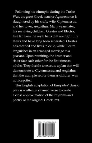 Following his triumphs during the Trojan War, the great Greek warrior Agamemnon is slaughtered by his crafty wife, Clytemnestra, and her lover, Aegisthus. Many years later, his surviving children, Orestes and Electra, live far from the royal halls that are rightfully theirs and have long been separated: Orestes has escaped and lives in exile, while Electra languishes in an arranged marriage to a peasant. Upon reuniting, the brother and sister face each other for the first time as adults. They decide to execute a plan that will demonstrate to Clytemnestra and Aegisthus that the example set for them as children was not forgotten. This English adaptation of Euripides' classic play is written in rhymed verse to create a close approximation of the rhythms and poetry of the original Greek text.