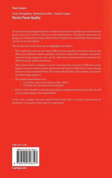 The key features of the book can be highlighted as follows: the contents focuses, on one hand, different power quality issues, their sources and effects and different related standards, which are required for students, researchers and practising engineers and, on the other hand, measurement techniques for different power quality parameters, the content level is designed in such a way that the concepts of different power quality issues in modern power system are built up first, followed by some existing and new measurement methods. This content should attract the students, researchers and practising engineers, the predominant features are Lucid but concise description of the subject, detailed new measurement techniques and Electric Power Quality is intended for graduate, postgraduate and researchers as well as for professionals in the related fields.