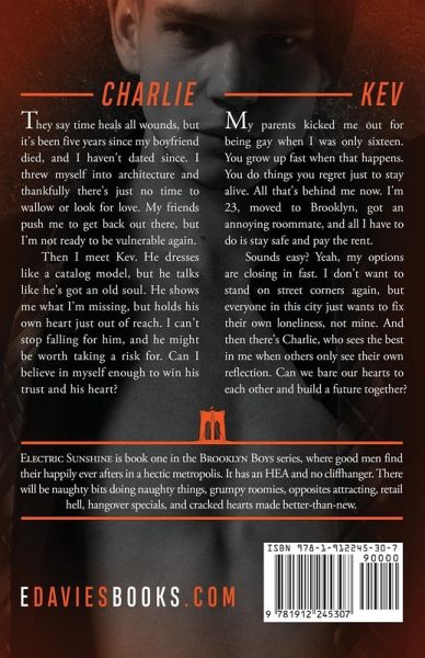 Charlie: They say time heals all wounds, but it's been five years since my boyfriend died, and I haven't dated since. I threw myself into architecture and thankfully there's just no time to wallow or look for love. My friends push me to get back out there, but I'm not ready to be vulnerable again. Then I meet Kev. He dresses like a catalog model, but he talks like he's got an old soul. He shows me what I'm missing, but holds his own heart just out of reach. I can't stop falling for him, and he might be worth taking a risk for. Can I believe in myself enough to win his trust and his heart? Kev: My parents kicked me out for being gay when I was only sixteen. You grow up fast when that happens. You do things you regret just to stay alive. All that's behind me now. I'm 23, moved to Brooklyn, got an annoying roommate, and all I have to do is stay safe and pay the rent. Sounds easy? Yeah, my options are closing in fast. I don't want to stand on street corners again, but everyone in this city just wants to fix their own loneliness, not mine. And then there's Charlie, who sees the best in me when others only see their own reflection. Can we bare our hearts to each other and build a future together? Electric Sunshine is book one in the Brooklyn Boys series, where good men find their happily ever afters in a hectic metropolis. It has an HEA and no cliffhanger. There will be naughty bits doing naughty things, grumpy roomies, opposites attracting, retail hell, hangover specials, and cracked hearts made better-than-new.