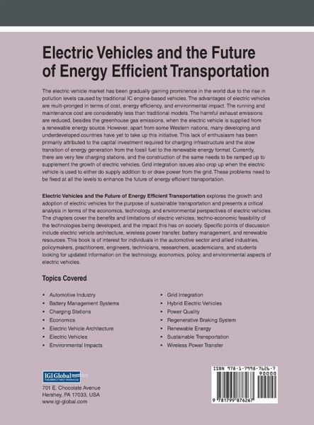 The electric vehicle market has been gradually gaining prominence in the world due to the rise in pollution levels caused by traditional IC engine-based vehicles. The advantages of electric vehicles are multi-pronged in terms of cost, energy efficiency, and environmental impact. The running and maintenance cost are considerably less than traditional models. The harmful exhaust emissions are reduced, besides the greenhouse gas emissions, when the electric vehicle is supplied from a renewable energy source. However, apart from some Western nations, many developing and underdeveloped countries have yet to take up this initiative. This lack of enthusiasm has been primarily attributed to the capital investment required for charging infrastructure and the slow transition of energy generation from the fossil fuel to the renewable energy format. Currently, there are very few charging stations, and the construction of the same needs to be ramped up to supplement the growth of electric vehicles. Grid integration issues also crop up when the electric vehicle is used to either do supply addition to or draw power from the grid. These problems need to be fixed at all the levels to enhance the future of energy efficient transportation. Electric Vehicles and the Future of Energy Efficient Transportation explores the growth and adoption of electric vehicles for the purpose of sustainable transportation and presents a critical analysis in terms of the economics, technology, and environmental perspectives of electric vehicles. The chapters cover the benefits and limitations of electric vehicles, techno-economic feasibility of the technologies being developed, and the impact this has on society. Specific points of discussion include electric vehicle architecture, wireless power transfer, battery management, and renewable resources. This book is of interest for individuals in the automotive sector and allied industries, policymakers, practitioners, engineers, technicians, researchers, academicians, and students looking for updated information on the technology, economics, policy, and environmental aspects of electric vehicles.