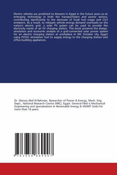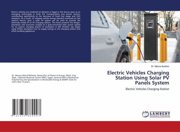 Electric vehicles are predicted to blossom in Egypt in the future years as an emerging technology in both the transportation and power sectors, contributing significantly to the decrease of fossil fuel usage and CO2 emissions. As a result, to mitigate vehicle energy demand overloads on the nation's electric grid, a solar PV system can be used to provide the electricity needs of an EV charging station. This book presents the design, simulation and economic analysis of a grid-connected solar power system for an electric charging station at workplace in 6th October city, Egypt using PVSOL simulation tool to supply energy to the charging station and office building appliances.