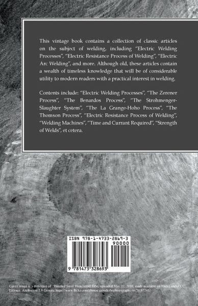 This vintage book contains a collection of classic articles on the subject of welding, including "Electric Welding Processes", "Electric Resistance Process of Welding", "Electric Arc Welding", and more. Although old, these articles contain a wealth of timeless knowledge that will be of considerable utility to modern readers with a practical interest in welding. Contents include: "Electric Welding Processes", "The Zerener Process", "The Benardos Process", "The Strohmenger-Slaughter System", "The La Grange-Hoho Process", "The Thomson Process", "Electric Resistance Process of Welding", "Welding Machines", "Time and Currant Required", "Strength of Welds", et cetera. Many vintage books such as this are increasingly scarce and expensive. We are republishing this volume now in an affordable, modern edition complete with a specially commissioned new introduction on metalworking.