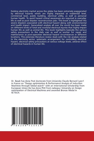 Existing electricity market across the globe has been extremely exaggerated by electrical hazards which are highly impacted at residential level, commercial level, public building, electrical utility, as well as personal human health. To avoid hazard critical awareness are required in everyday life as well as post disaster reconstruction jobs. This book is highlighted the severe disasters associated with electrical hazard along with environmental and health impact. Generalized analysis all over the world has been made on different kinds of fatal and nonfatal electrical injuries that highly impact human life as well as animal life. This book highlights basically the various safety precautions to the daily user as well as worker for repair and maintenance as post-operative electrical hazard circumstances in different locations. This extensive literature review deals with the risk analysis related to the electricity sector, systematic arrangement for controlling electrical hazard, electrical safety precautions at various voltage levels, adverse effect of electrical hazards in human life.