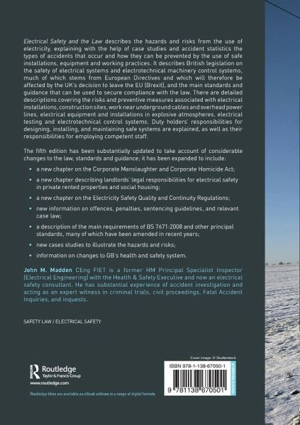 Electrical Safety and the Law describes the hazards and risks from the use of electricity, explaining with the help of case studies and accident statistics the types of accidents that occur and how they can be prevented by the use of safe installations, equipment and working practices. It describes the British legislation on the safety of electrical systems and electrotechnical machinery control systems, much of which stems from European Directives and which will therefore be affected by the UK's decision to leave the EU (Brexit), and the main standards and guidance that can be used to secure compliance with the law. There are detailed descriptions covering the risks and preventive measures associated with electrical installations, construction sites, work near underground cables and overhead power lines, electrical equipment and installations in explosive atmospheres, electrical testing and electrotechnical control systems. Duty holders' responsibilities for designing, installing, and maintaining safe systems are explained, as well as their responsibilities for employing competent staff. The fifth edition has been substantially updated to take account of considerable changes to the law, standards and guidance; it has been expanded to include: a new chapter on the Corporate Manslaughter and Corporate Homicide Act; a new chapter describing landlords' legal responsibilities for electrical safety in private rented properties and social housing; a new chapter on the Electricity Safety Quality and Continuity Regulations; new information on offences, penalties, sentencing guidelines, and relevant case law; a description of the main requirements of BS 7671:2008 and other principal standards, many of which have been amended in recent years; new cases studies to illustrate the hazards and risks; information on changes to GB's health and safety system.