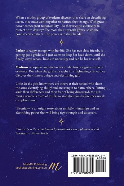 When a motley group of students discover they share an electrifying secret, they must work together to harness their energy. With great power comes great responsibility - do they use this electricity to protect or to destroy? The more their strength grows, so do the bonds between them. The power is in their hands. Parker is happy enough with her life. She has two close friends, is getting good grades and just wants to keep her head down until she finally leaves school, head to university and be her true self. Madison is popular, and she knows it. She barely registers Parker's existence. But when the girls are caught in a frightening crime, they discover they share a unique and electrifying gift. Little do the girls know there are others at their school who share the same electrifying ability and are using it to harm others. Putting aside their differences and their fear of being discovered, the girls must assemble a team of misfits to stop their foes before they wreak complete havoc. 'Electricity' is an origin story about unlikely friendships and an electrifying power that will bring new strength and discovery. 'Electricity' is the second novel by acclaimed writer, filmmaker and broadcaster, Wayne Tunks.