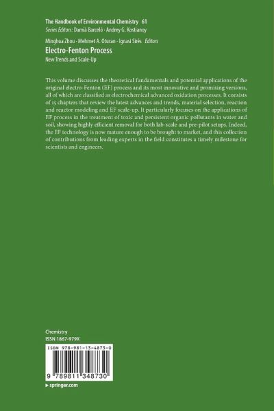 This volume discusses the theoretical fundamentals and potential applications of the original electro-Fenton (EF) process and its most innovative and promising versions, all of which are classified as electrochemical advanced oxidation processes. It consists of 15 chapters that review the latest advances and trends, material selection, reaction and reactor modeling and EF scale-up. It particularly focuses on the applications of EF process in the treatment of toxic and persistent organic pollutants in water and soil, showing highly efficient removal for both lab-scale and pre-pilot setups. Indeed, the EF technology is now mature enough to be brought to market, and this collection of contributions from leading experts in the field constitutes a timely milestone for scientists and engineers.