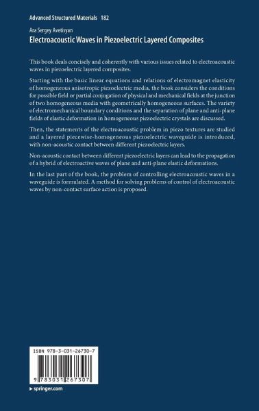 This book deals concisely and coherently with various issues related to electroacoustic waves in piezoelectric layered composites.Starting with the basic linear equations and relations of electromagnet elasticity of homogeneous anisotropic piezoelectric media, the book considers the conditions for possible field or partial conjugation of physical and mechanical fields at the junction of two homogeneous media with geometrically homogeneous surfaces. The variety of electromechanical boundary conditions and the separation of plane and anti-plane fields of elastic deformation in homogeneous piezoelectric crystals are discussed.Then, the statements of the electroacoustic problem in piezo textures are studied and a layered piecewise-homogeneous piezoelectric waveguide is introduced, with non-acoustic contact between different piezoelectric layers.Non-acoustic contact between different piezoelectric layers can lead to the propagation of a hybrid of electroactive waves of plane and anti-plane elastic deformations.In the last part of the book, the problem of controlling electroacoustic waves in a waveguide is formulated. A method for solving problems of control of electroacoustic waves by non-contact surface action is proposed.