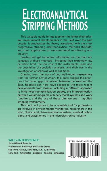 Incorporating the latest theoretical and experimental developments in the field over the past decade, Brainina and Neyman's Electroanalytical Stripping Methods focuses on the theory associated with the most progressive stripping electroanalytical methods (SEAMs) and their application to environmental monitoring and industry. Wherever appropriate, it highlights the main advantages of these methods, including their extremely low detection limit, the low cost of the instruments used, the possibility of speciation analysis, and their use in the investigation of solids as well as solutions. The combined work of two eminent researchers from the former Soviet Union, the book closes the previous information gap that existed between West and East and now makes accessible the most recent developments from Russia, including a different approach to initial electro-crystallization stages, the interconnection between voltammograms of binary metal systems and work functions, and the use of these phenomena in applied stripping voltammetry. Electroanalytical Stripping Methods also provides a critical assessment of current achievements in the field of electrode materials, and in the design of electrodes and electrochemical cells used in stripping methods. Here, the authors provide unique insight into the advantages of graphite electrodes - largely used in the East - over glassy carbon electrodes generally favored by the West. The book presents a number of other modern ideas, including the theory behind and the application of a new internal standard in stripping voltammetry...the catalysis of metals electrodeposition on the foreign substrate with adatoms...and the electrochemical transformation of solidsand adsorbates and their use in phase analysis and the investigation of the defect structure of solids. Electroanalytical Stripping Methods will prove to be an invaluable tool for professionals involved in environmental monitoring, helping them to develop and use trace analysis in evaluating drinking water, food, waste, and other solids and solutions and to apply stripping voltammetry to the analyses of chemicals. Researchers in the food, clinical, and pharmaceutical industries will similarly use the book to develop and apply SEAMs for trace analysis. Practitioners in the microelectronics industry will find useful information on solids that will help them improve the quality of catalyzers, films, special ceramics, and semiconductors. Finally, medical technicians will tap this resource for the insight it can provide in the electroanalysis of blood, urine, and other body fluids.