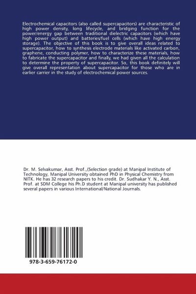 Electrochemical capacitors (also called supercapacitors) are characteristic of high power density, long lifecycle, and bridging function for the power/energy gap between traditional dielectric capacitors (which have high power output) and batteries/fuel cells (which have high energy storage). The objective of this book is to give overall ideas related to supercapacitor, how to synthesis electrode materials like activated carbon, graphene, conducting polymer, how to characterize these materials, how to fabricate the supercapacitor and finally, we had given all the calculation to determine the property of supercapacitor. So, this book definitely will give overall representation about supercapacitor for those who are in earlier carrier in the study of electrochemical power sources.