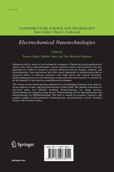 In this book, the term "electrochemical nanotechnology" is defined as nanoprocessing by means of electrochemical techniques. This introductory book reviews the application of electrochemical nanotechnologies with the aim of understanding their wider applicability in evolving nanoindustries. These advances have impacted microelectronics, sensors, materials science, and corrosion science, generating new fields of research that promote interaction between biology, medicine, and microelectronics.