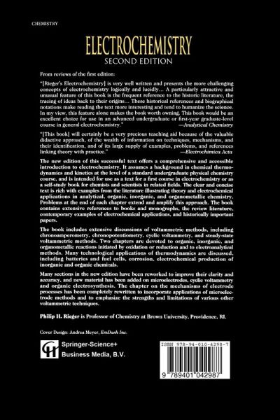 Reviews of the first edition:; [Reiger's Electrochemistry] is very well written and presents the more challenging concepts of electrochemistry logically and lucidly .... A particularly attractive and unusual feature of this book is the frequent reference to the historic literature, the tracing of ideas back to their origins ..... These historical references and biographical notations make reading the text more interesting and tend to humanize the science. In my view, this feature alone makes the book worth owning. This book would be an excellent choice for use in an advanced undergraduate or first-year graduate-level course in general electrochemistry. - Analytical Chemistry.; [This book] will certainly be a very precious teaching aid because of the valuable didactic approach, of the wealth of information on techniques, mechanisms, and their identification, and of its large supply of examples, problems, and references linking theory and practice. - Electrochemica Acta.; [Reiger's Electrochemistry] is very well written and presents the more challenging concepts of electrochemistry logically and lucidly .... A particularly attractive and unusual feature of this book is the frequent reference to the historic literature, the tracing of ideas back to their origins ..... These historical references and biographical notations make reading the text more interesting and tend to humanize the science. In my view, this feature alone makes the book worth owning. This book would be an excellent choice for use in an advanced undergraduate or first-year graduate-level course in general electrochemistry. - Analytical Chemistry.; [This book] will certainly be a very precious teaching aid because of the valuable didactic approach, of the wealth of information on techniques, mechanisms, and their identification, and of its large supply of examples, problems, and references linking theory and practice. - Electrochemica Acta.; [This book] will certainly be a very precious teaching aid because of the valuable didactic approach, of the wealth of information on techniques, mechanisms, and their identification, and of its large supply of examples, problems, and references linking theory and practice. - Electrochemica Acta.