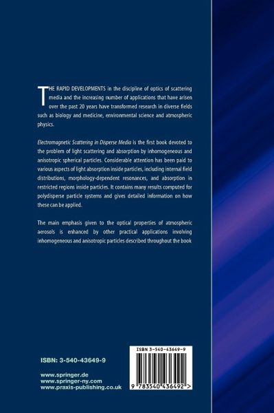 This is the first book devoted specifically to the problem of light scattering and absorption by inhomogeneous and anisotropic spherical particles. Unlike other books in the field, Electromagnetic Scattering in Disperse Media pays considerable attention to various aspects of light absorption inside particles, including internal field distributions, MDR resonances, and absorption in restricted regions inside particles. It contains many results (and more than 100 figures) computed for polydisperse particle systems and algorithms and provides the possibility to use them (web site). Although the main emphasis is given to optical properties of atmospheric aerosol, the book also deals with many other practical applications involving inhomogeneous and anisotropic particles.