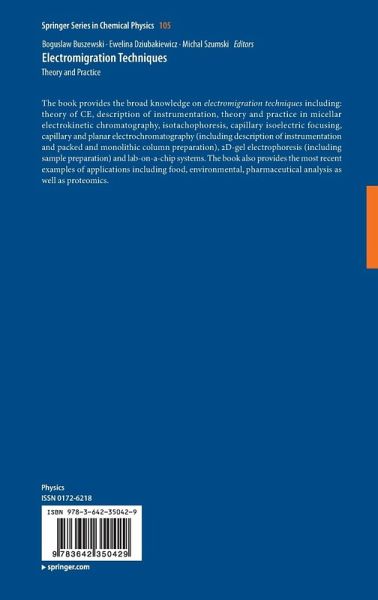 Outline of the history.- Principles of electromigration techniques.- Instrumentation.- Qualitative and quantitative analysis.- Micellar Electrokinetic Chromatography (MEKC).- Isotachophoresis (ITP).- Capillary isoelectric focusing (CIEF).- Two-dimensional gel electrophoresis (2DE).- Electrochromatography.- Non-aqueous capillary electrophoresis.- On-capillary sample stacking methods.- Chiral separation.- "Lab-on-a-Chip" for cells analysis.- Applications of electromigration techniques.