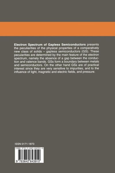 Electron Spectrum of Gapless Semiconductors presents the peculiarities of physical properties of a comparatively new class of solids - gapless semiconductors (GS). These peculiarities are determined by the main feature of the elctron spectrum, namely the absence of a gap between the conduction and valence bands. GSs form a boundary between metals and semiconductors. On the other hand GSs are of practical interest since they are very sensitive to impurities, and to the influence of light, magnetic and electric fields, and pressure.