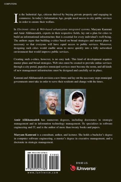 In the Industrial Age, citizens thrived by buying private property and engaging in commerce. In today's Information Age, people need access to city public services in order to ensure their welfare. In Electronic cities & Web-based urbanization integrated systems, Maryam Kamrani and Amir Alikhanzadeh, experts in their respective fields, lay out a plan for cities to build an informational infrastructure that is essential for every individual's well-being. The authors argue that building e-cities based on broad strategies and master plans is necessary so that everyone will have equal access to public services. Moreover, designing such cities would enable areas to move quickly into a fully networked environment that would improve public services. Creating such e-cities, however, is no easy task. This kind of development requires master plans and broad strategies. Web sites must be created to provide online services through a city portal, paperless municipal services must become the norm, and all kinds of new management infrastructure must be designed and carefully set in place. Kamrani and Alikhanzadeh envision a new future and lay out the necessary steps municipal governments must take in order to serve their residents and change with the times.