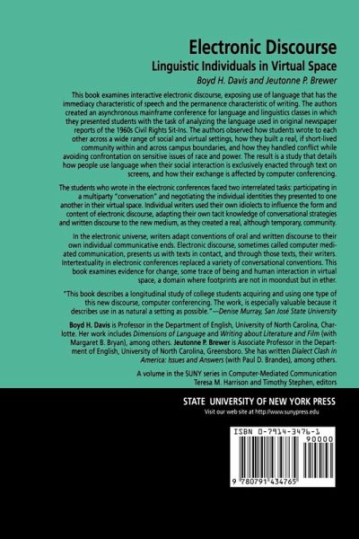 Investigates the new world of computer conferencing and details how writers use language when their social interaction is exclusively enacted through text on screens.