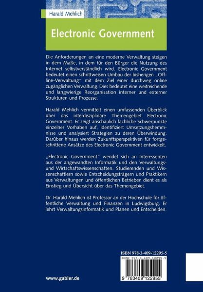 Harald Mehlich vermittelt einen umfassenden Überblick über das interdisziplinäre Themengebiet Electronic Government. Er zeigt anschaulich fachliche Schwerpunkte einzelner Vorhaben auf, identifiziert Umsetzungshemmnisse und analysiert Strategien zu deren Überwindung. Darüber hinaus werden Zukunftsperspektiven für fortgeschrittene Ansätze des Electronic Government entwickelt.