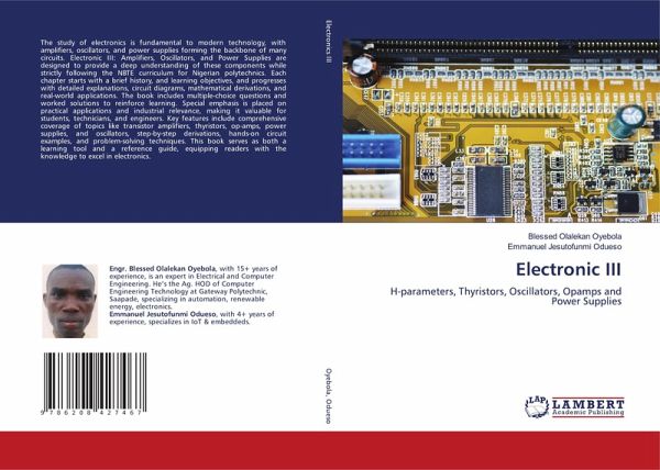 The study of electronics is fundamental to modern technology, with amplifiers, oscillators, and power supplies forming the backbone of many circuits. Electronic III: Amplifiers, Oscillators, and Power Supplies are designed to provide a deep understanding of these components while strictly following the NBTE curriculum for Nigerian polytechnics. Each chapter starts with a brief history, and learning objectives, and progresses with detailed explanations, circuit diagrams, mathematical derivations, and real-world applications. The book includes multiple-choice questions and worked solutions to reinforce learning. Special emphasis is placed on practical applications and industrial relevance, making it valuable for students, technicians, and engineers. Key features include comprehensive coverage of topics like transistor amplifiers, thyristors, op-amps, power supplies, and oscillators, step-by-step derivations, hands-on circuit examples, and problem-solving techniques. This book serves as both a learning tool and a reference guide, equipping readers with the knowledge to excel in electronics.