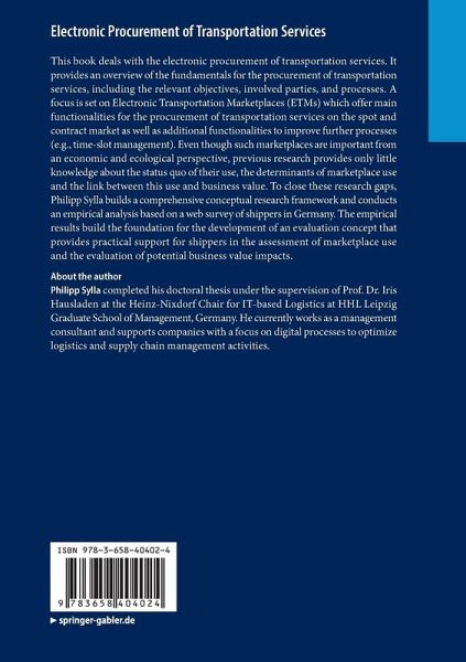 This book deals with the electronic procurement of transportation services. It provides an overview of the fundamentals for the procurement of transportation services, including the relevant objectives, involved parties, and processes. A focus is set on Electronic Transportation Marketplaces (ETMs) which offer main functionalities for the procurement of transportation services on the spot and contract market as well as additional functionalities to improve further processes (e.g., time-slot management). Even though such marketplaces are important from an economic and ecological perspective, previous research provides only little knowledge about the status quo of their use, the determinants of marketplace use and the link between this use and business value. To close these research gaps, Philipp Sylla builds a comprehensive conceptual research framework and conducts an empirical analysis based on a web survey of shippers in Germany. The empirical results build the foundation for the development of an evaluation concept that provides practical support for shippers in the assessment of marketplace use and the evaluation of potential business value impacts.