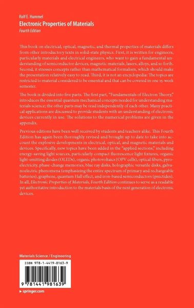 Part I: Fundamentals of Electron Theory: Introduction. Wave Properties of Electrons. The Schroedinger Equation. Solution of the Schroedinger Equation for Four Specific Problems. Energy Bands in Crystals. Electrons in a Crystal.- Part II: Electrical Properties of Materials: Electrical Conduction in Metals and Alloys. Semiconductors. Electrical Properties of Polymers, Ceramics, Dielectrics and Amorphous Materials.- Part III: Optical Properties of Materials: The Optical Constants. Atomistic Theory of the Optical Properties. Quantum Mechanical Treatment of the Optical Properties. Applications.- Part IV: Magnetic Properties of Materials: Foundations of Magnetism. Magnetic Phenomena and Their Interpretation - Classical Approach. Quantum Mechanical Considerations. Applications.- Part V: Thermal Properties of Materials: Introduction. Fundamentals of Thermal Properties. Heat Capacity. Thermal Conduction. Thermal Expansion.- Appendices.- Index.