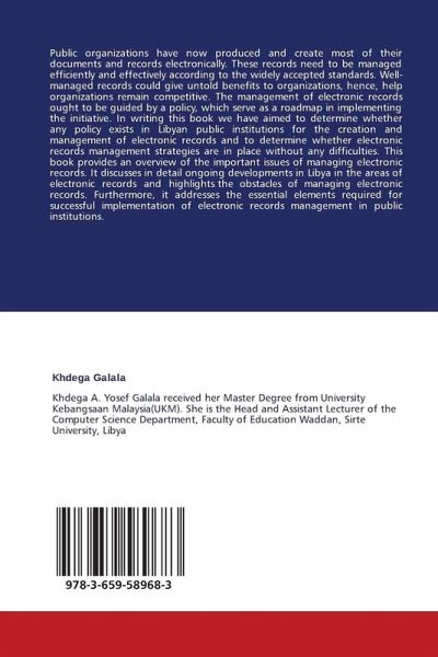 Public organizations have now produced and create most of their documents and records electronically. These records need to be managed efficiently and effectively according to the widely accepted standards. Well-managed records could give untold benefits to organizations, hence, help organizations remain competitive. The management of electronic records ought to be guided by a policy, which serve as a roadmap in implementing the initiative. In writing this book we have aimed to determine whether any policy exists in Libyan public institutions for the creation and management of electronic records and to determine whether electronic records management strategies are in place without any difficulties. This book provides an overview of the important issues of managing electronic records. It discusses in detail ongoing developments in Libya in the areas of electronic records and highlights the obstacles of managing electronic records. Furthermore, it addresses the essential elements required for successful implementation of electronic records management in public institutions.